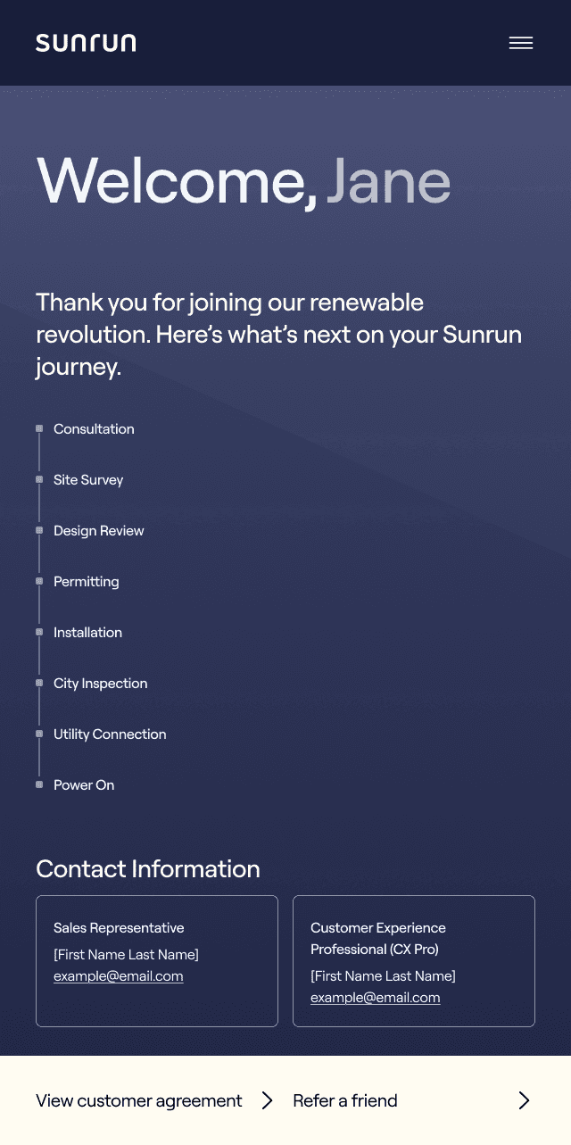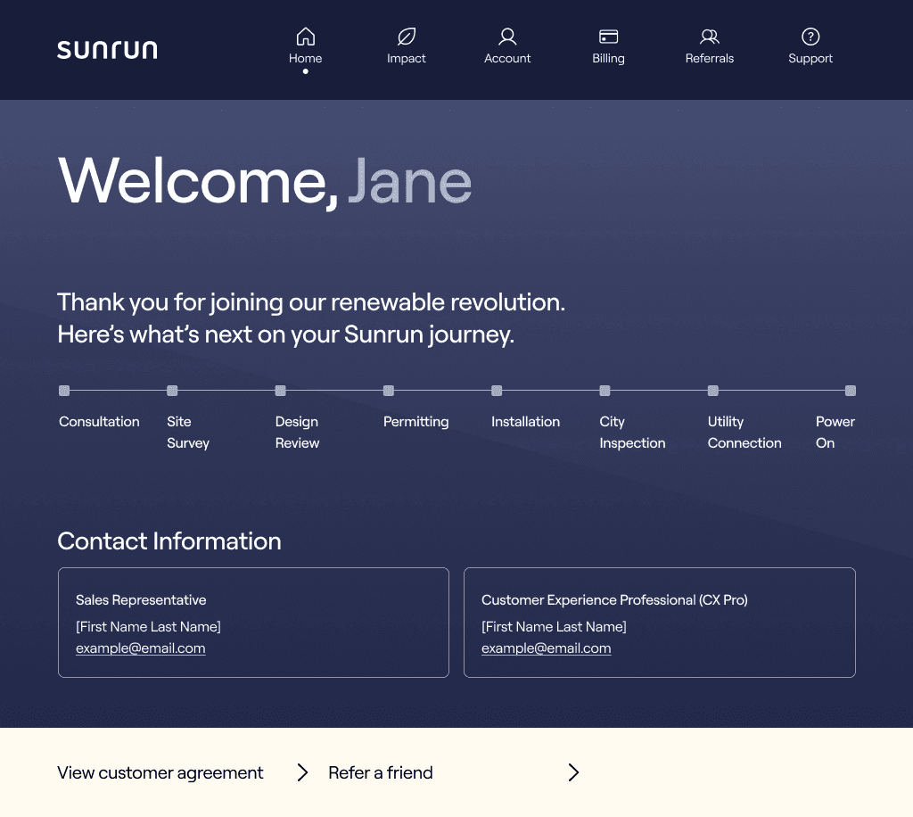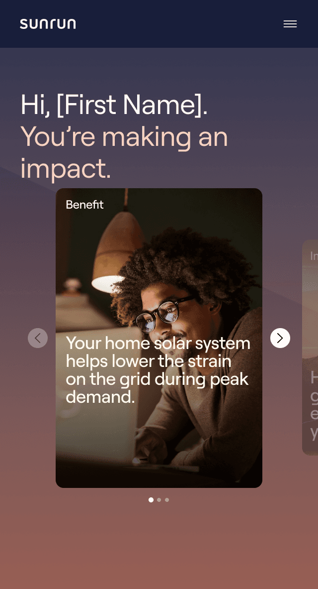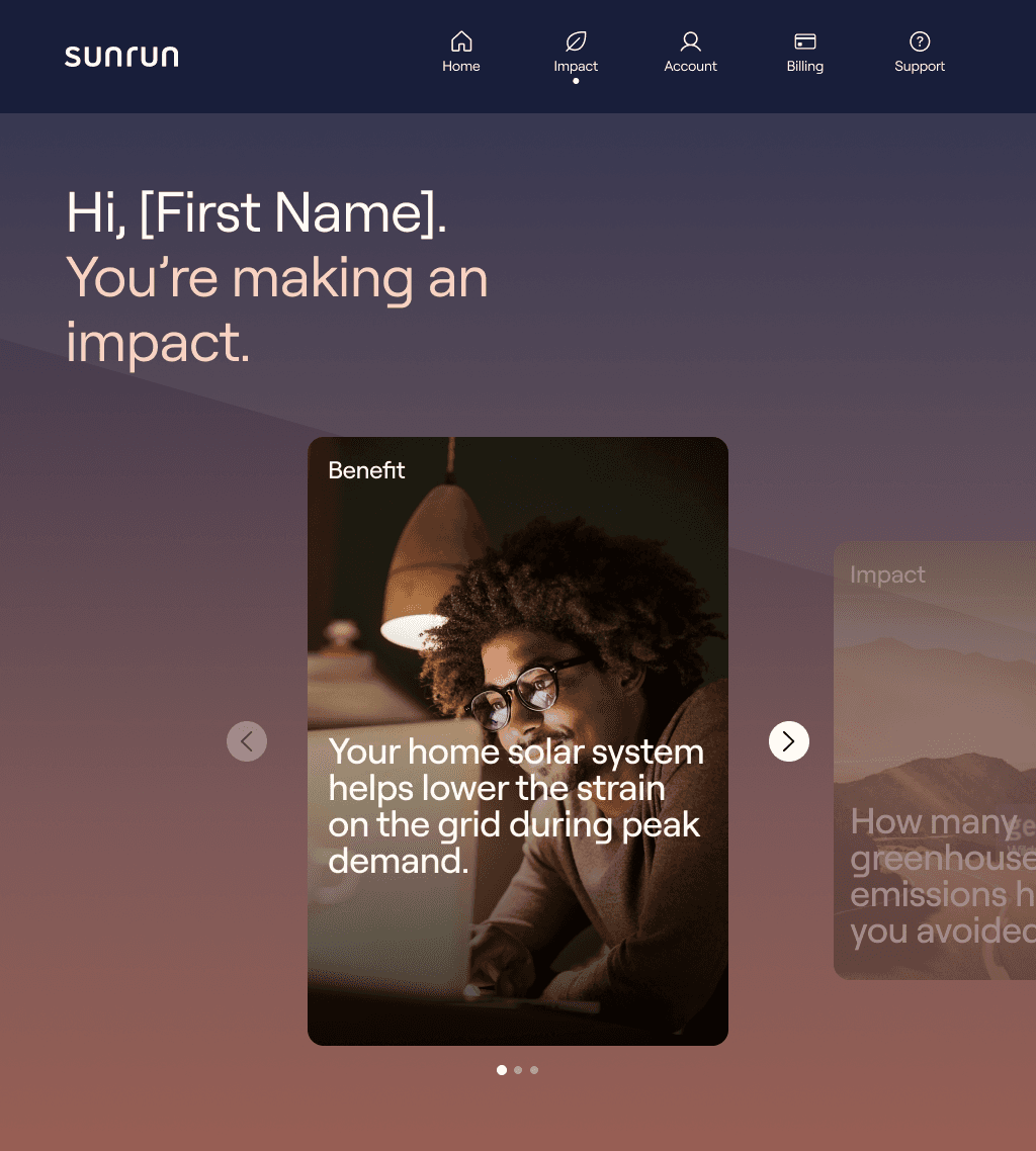Shows savings, energy production, and carbon footprint reduction, making Sunrun’s value tangible and motivating engagement.